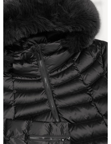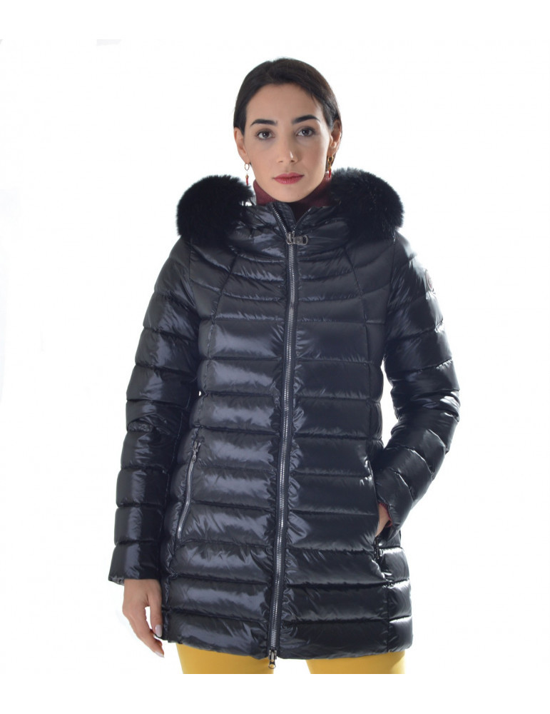 Vertical lines elongate the figure, while the faux fur hood adds a romantic touch. This padded jacket is the perfect ally for those seeking style and protection, with side pockets completing the design.