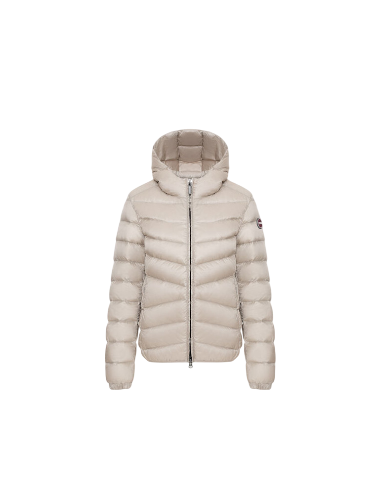 The iridescent finish and oblique quilting are the distinctive details of this down jacket with hood and side pockets. The tone-on-tone elasticated hem and cuffs discreetly complete the design, ensuring comfort and practicality.