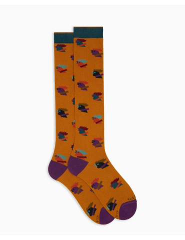 Long men's Gallo socks in blue cotton with multicolored roosters pattern AP514272