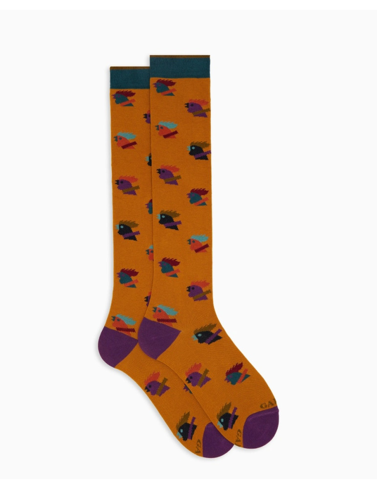 Long socks for men made in Italy in light and elastic blue cotton. The iconic pattern of multicolor roosters makes them original and recognizable. Gallo: synonymous with quality and excellence since 1927.