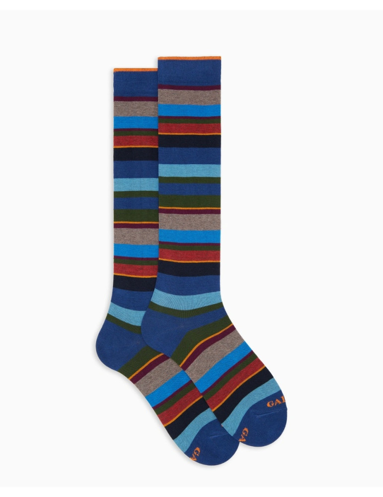 Gambaletto uomo maglia rasata in cotone elasticizzato, riga multicolor di colore bordeaux - blu elettrico - blu scuro - grigio scuro - grigio medio e taglia unica corrispondente al 40-45 di piede.