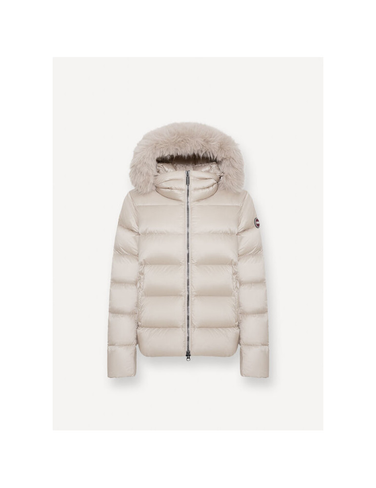 Il cappuccio orlato in pelliccia sintetica, unito al filato che crea una gamma di colori cangianti, fa di questo piumino un vero e proprio simbolo di femminilità. Il collo alto assicura massima protezione dal freddo, mentre le tasche laterali e il fondo regolabile offrono comfort e funzionalità.