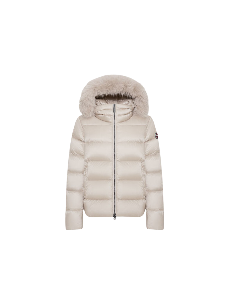Il cappuccio orlato in pelliccia sintetica, unito al filato che crea una gamma di colori cangianti, fa di questo piumino un vero e proprio simbolo di femminilità. Il collo alto assicura massima protezione dal freddo, mentre le tasche laterali e il fondo regolabile offrono comfort e funzionalità.