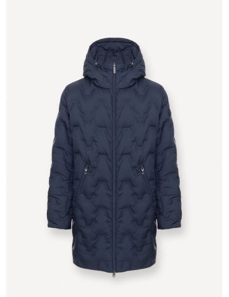 Combina uno stile classico a un tocco contemporaneo, questo piumino lungo reversibile si adatta a ogni occasione. Da un lato, tessuto stretch liscio, dall’altro, trapuntatura geometrica a V. Il cappuccio regolabile e le tasche laterali offrono protezione, unendo praticità e stile in un unico capo.